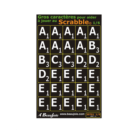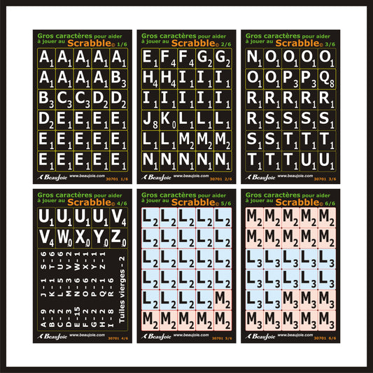 Clearly identify the letters in your Scrabble game with our stickers in French. With these larger, more visible characters, you can focus your playing time on strategy instead of deciphering the letters. Get the most out of your game with our adapted, durable and affordable products.