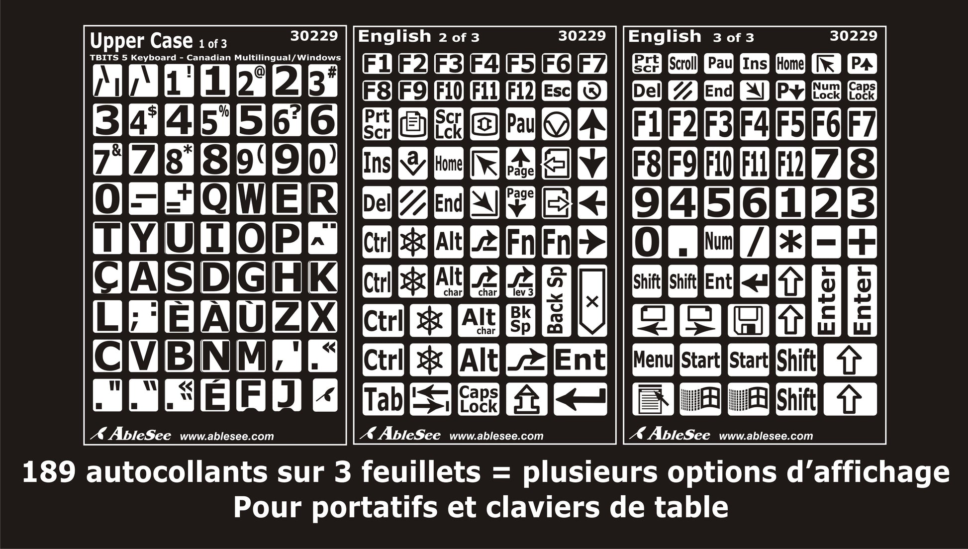 Optimize the visibility of keyboard symbols, numbers and letters with AbleSee’s durable, high-quality products. Multiple display options are available for your US English and Canadian French Windows keyboard with bilingual function keys.