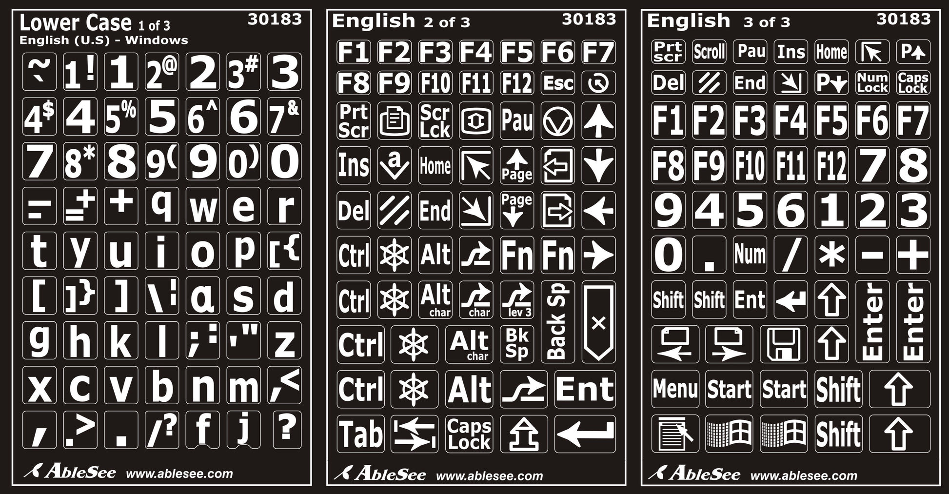 AbleSee offers a way to improve the visibility of your US English Windows keyboard. Options include adapted layouts with features such as row division and left/right division. We also provide effective color contrasts designed to enhance your typing speed and improve your overall keyboard experience.