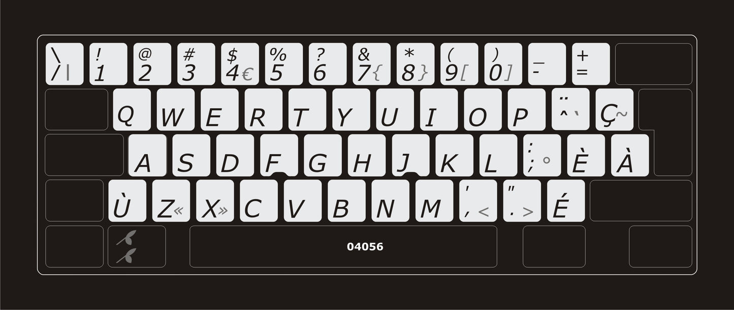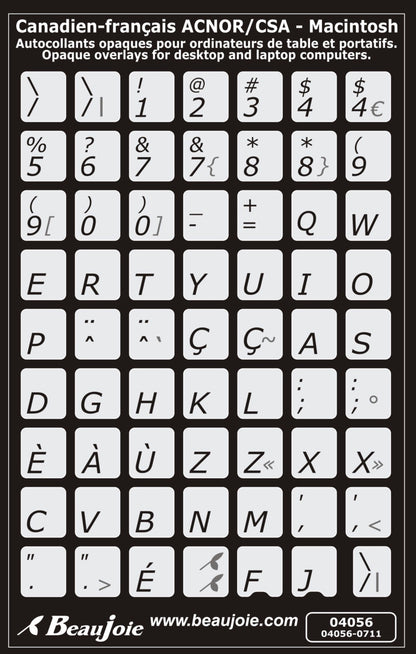 63 quality opaque black on gray stickers for your French Mac keyboard (Canada): a simple solution to increase the readability of the characters in the central part of your keyboard.
