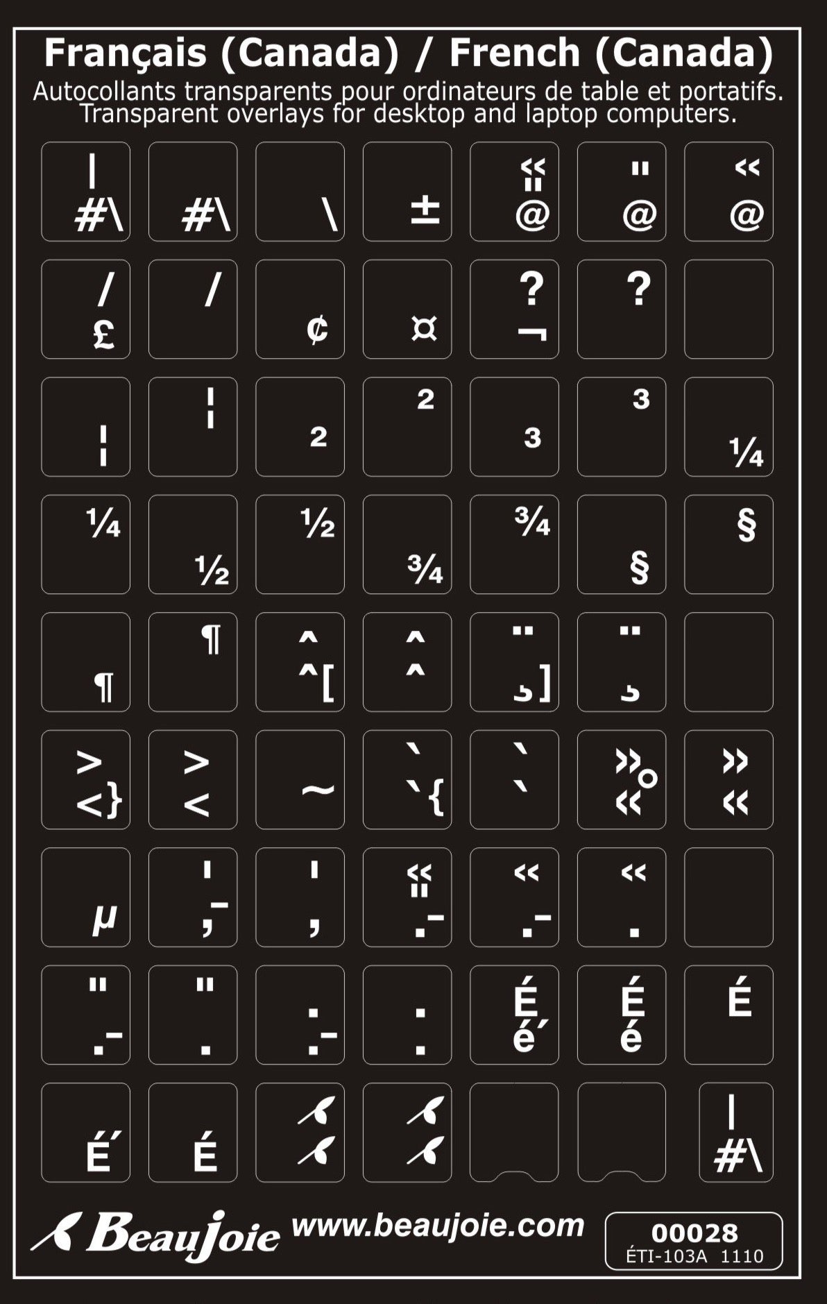 These transparent stickers allow you to add only the necessary characters for a Canadian French keyboard, while preserving the original look of your keyboard. They’re perfect for adapting an English QWERTY keyboard without covering all the keys. Easy to apply, they offer a discreet and affordable solution—ideal for laptops with light-colored keyboards, such as those from HP.